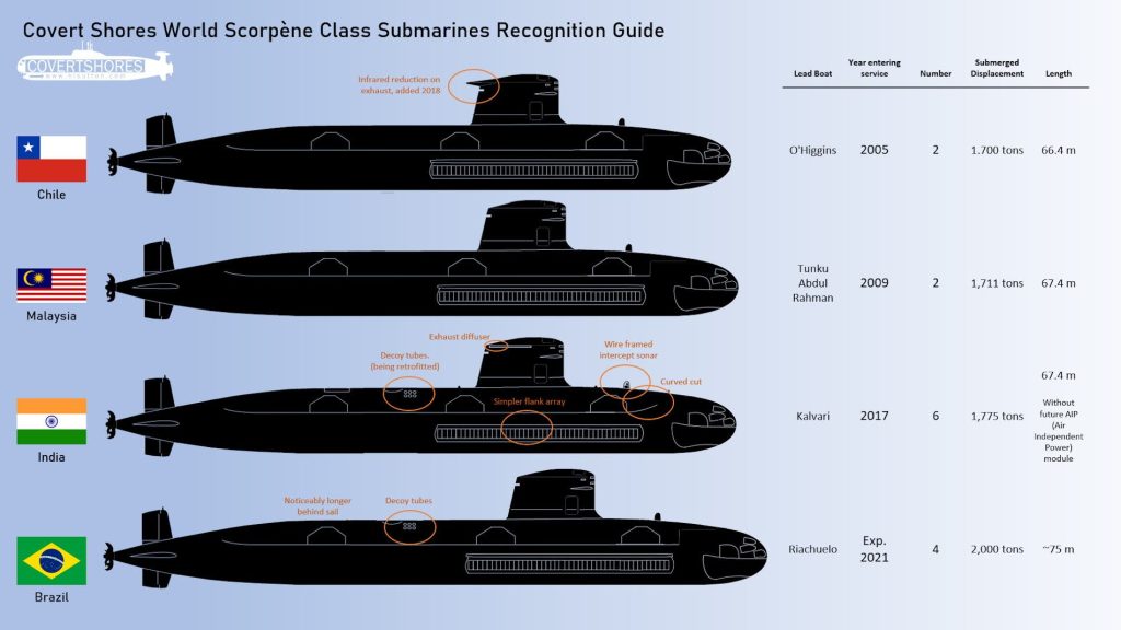 La Clase Scorpene, desarrollada por un consorcio franco-español, es reconocida a nivel internacional por su versatilidad y tecnología avanzada. Estos submarinos, de quinta generación, pueden ser adaptados a las necesidades específicas de cada marina y están diseñados para lanzar torpedos, misiles de crucero y minas. Además, cuentan con la posibilidad de incorporar sistemas de propulsión independiente del aire (AIP), lo que les otorga una mayor autonomía en inmersión.