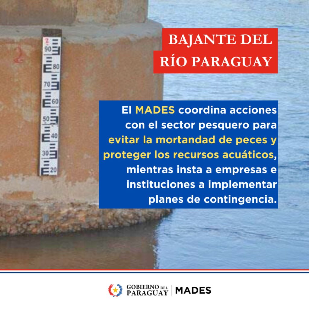 El Ministerio del Ambiente y Desarrollo Sostenible (MADES) emitió una alerta ante la crítica bajante del río Paraguay, causada por la prolongada sequía que afecta la región. Esta situación pone en riesgo los ecosistemas acuáticos, comprometiendo tanto el abastecimiento de agua como la biodiversidad en la cuenca, con un alto riesgo de mortandad de peces.