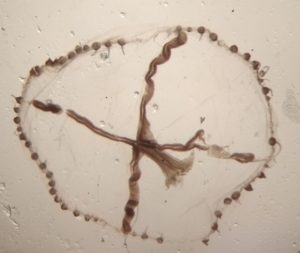 ¿Cómo es la Blackfordia virginica? La respuesta no está a simple vista. Se tiene que usar una malla de perforaciones diminutas para atraparla y una lupa especializada para observar su estructura y así identificar la especie. Mide hasta un centímetro por lo que una sola puede pasar inadvertida pero al protagonizar blooms se la puede encontrar por centenas. Por tamaño recuerda a la tapioca (Liriope tetraphylla), una conocida medusa de nuestras playas que puede amargar un día de verano por su sustancia urticante. Algo bueno de la Blackfordia virginica es que no pica. Pero la pregunta más importante es: ¿cómo llegó hasta la laguna de Rocha si es originaria del Mar Caspio y el Mar Negro? El viaje lo comenzó hace tiempo. En la década de 1960 ya había sido registrada en el Atlántico Sur y en el 2000 fue vista en el Río de la Plata (fuera de la parte correspondiente a Uruguay). Victoria Vidal, investigadora de Ecología Funcional de Sistemas Acuáticos en Centro Universitario Regional del Este (CURE) dijo a El País: “Como muchas especies invasoras marinas se atribuye su dispersión por el tráfico de barcos”.