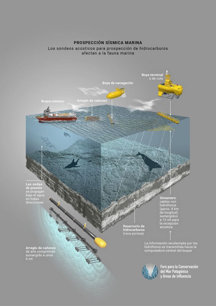 Bajo el oleaje, a seis metros de profundidad, los cañones del buque sísmico típico disparan aire al agua por milésimas de segundo cada 10 segundos —o 25 metros—. Así generan ondas sonoras que penetran el subsuelo marino y se reflejan de distinta forma según su formación geológica. Las ondas son captadas por los hidrófonos —unos micrófonos para agua que transducen a electricidad los estruendos— que son arrastrados, seis metros más abajo, por el tendal de cables que tienen más diámetro que un CD. El problema es que las ondas son tan potentes que viajan grandes distancias, ya que se propagan más lejos y más rápido que por el aire. Las ondas «pueden viajar a cientos y miles de kilómetros, cuánto exactamente va a depender de cada lugar, de donde esté la fuente, de la intensidad, características hidrometeorológicas, del cuerpo de agua, profundidad, tipo de fondo, etcétera», explicó Cristián De Haro, investigador y docente del Grupo de Ecología del Paisaje y Medio Ambiente Dr. Jorge Morelo de la Universidad de Buenos Aires, y consultor del Instituto de Conservación de Ballenas. Él, junto a Falabella y otros cuatro expertos, es autor del informe sobre la prospección sísmica en el mar argentino. Por la cantidad de variables que influyen en la propagación de las ondas es difícil calcular qué alcance tienen. Sin embargo, un estudio realizado en el Atlántico medio entre 1999 y 2009 —publicado en 2012 y citado en el informe—, reveló que a pesar de la gran distancia entre los buques de prospección sísmica que trabajaban en los hemisferios norte y sur y en el Atlántico este y oeste, en todos los sitios relevados se registraron sus estruendos, en todos los meses del año, y en un caso, incluso a 4.000 kilómetros del barco de prospección. El enorme ruido introducido en el mar por la prospección sísmica —que se suma al del tráfico marino, explosiones, sonares militares y construcciones—, perjudica a la «biodiversidad en la columna de agua completa y con un radio de influencia que trasciende la zona de prospección del barco. (…) Eso no se puede tapar», resumió Falabella. Los disparos de aire dañan especialmente a los cetáceos —ballenas, cachalotes, delfines, orcas, marsopas y más—, que usan el sonido para alimentarse, reproducirse, sociabilizar, reconocer y cuidar de sus crías, evaluar qué pasa en su entorno, detectar posible comida y depredadores, trabajar en conjunto para capturar presas, navegar y comunicarse. El ruido puede producir «cambios de comportamiento y retrasos de desarrollo, hasta lesiones graves e incluso la muerte», indicó la bióloga marina. Por ello, allí donde se producen los estruendos y por miles de kilómetros a la redonda —según conservacionistas—, o por un área de radio no menor a 500 metros —dicen algunos protocolos petroleros—, no debería haber ningún animal.