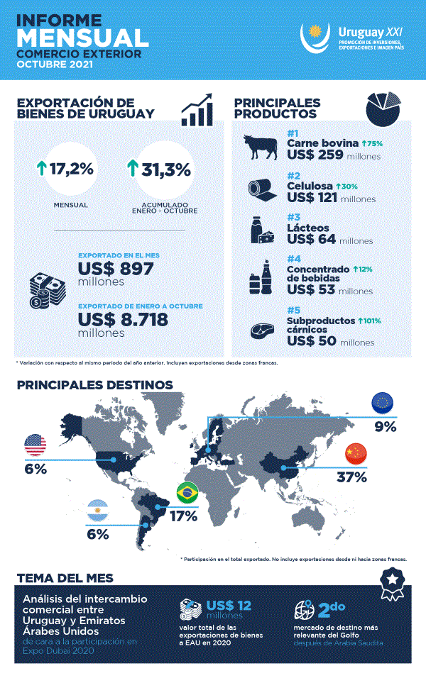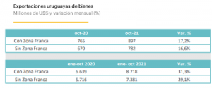 En octubre 2021 las solicitudes de exportación incluyendo zonas francas totalizaron US$ 897 millones, lo que marca un incremento de 17% respecto a igual mes del año pasado, de acuerdo al informe mensual elaborado por el Instituto Uruguay XXI.. El aumento de las exportaciones de carne bovina, celulosa, subproductos cárnicos y madera son los bienes con mayor incidencia positiva que explican la variación mensual. En el acumulado enero-octubre de 2021 las exportaciones totalizaron U$S 8.718 millones, registrando un aumento de 31% respecto a igual período de 2020. Carne bovina, energía eléctrica, celulosa, madera, subproductos cárnicos y concentrado de bebidas son los productos con mayor incidencia positiva en la variación del período. En octubre, las exportaciones desde aduanas (sin considerar las zonas francas) crecieron 16,6% en términos interanuales.
