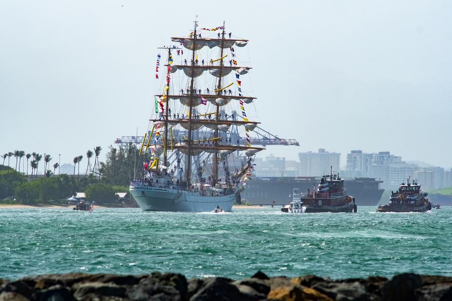 Su visita es parte de los festejos por el 500 aniversario de la ciudad capital. Cientos de personas abarrotaron este viernes las calles y aceras frente a los muelles de San Juan, para disfrutar del espectáculo de la llegada de los imponentes veleros que sirven de buque escuela de Colombia, México y Brasil, así como el de Uruguay, cuya llegada estaba programada para horas de la tarde, como parte de la celebración de la regata Festival Capital por los 500 años de San Juan. Desde temprano, decenas de curiosos comenzaron a llegar a la zona de los muelles, y pudieron ver atracar primero a la fragata ARC Gloria, de Colombia, en el muelle 4; luego a la fragata ARM Cuauhtémoc, de México, en el muelle 1; y poco después la fragata Cisne Branco, de Brasil, en el muelle 3. En la tarde atracaría la fragata Capitán Miranda, de Uruguay, también en el muelle 3.