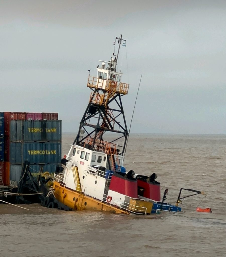 Sin embargo, durante la noche del 18 al 19 de abril, fuertes vientos provocaron el hundimiento total del remolcador, aumentando el riesgo de que la barcaza colisionara y se hundiera también. Frente a esta amenaza, se activó un segundo operativo con el remolcador ONA TRIUNFO y un equipo de salvamento que logró rehabilitar el sistema de fondeo, desvincular la barcaza del remolcador hundido y remolcarla de manera segura hasta el puerto de Buenos Aires.