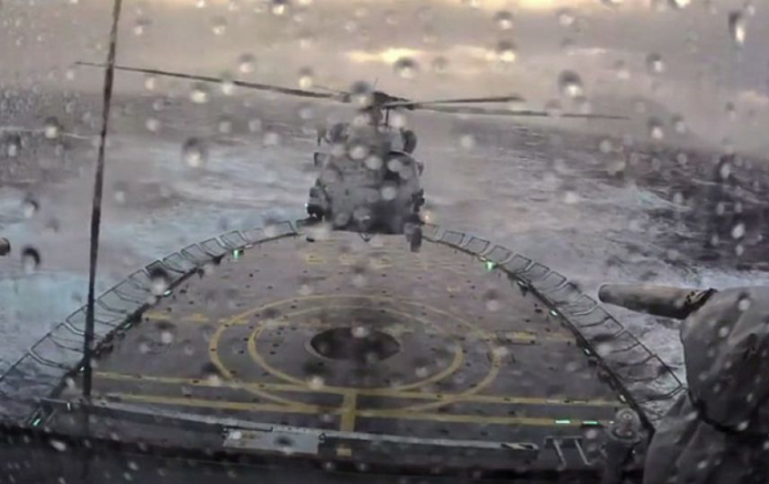 Un piloto de pruebas australiano acompañado de un danés experimentado eran los tripulantes del helicóptero Sikorsky MH-60R Seahawk. El entrenamiento se realizó en medio de una fuerte tormenta y con grandes olas que sacudían el buque.