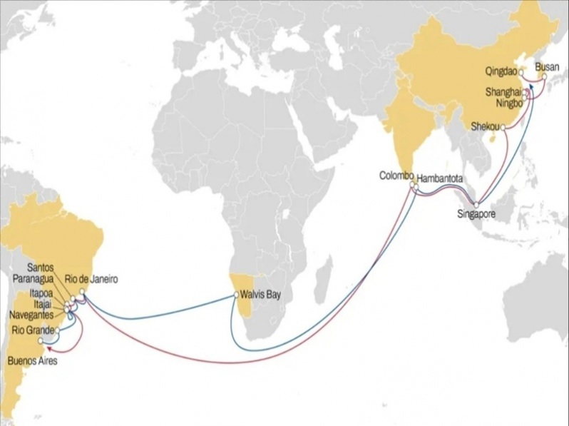 El itinerario hacia el Lejano Oriente incluirá: Buenos Aires – Río Grande – Navegantes – Itajaí – Itapoá – Santos – Río de Janeiro – Walvis Bay (Namibia) – Hambantota (Sri Lanka) – Singapur – Qingdao.