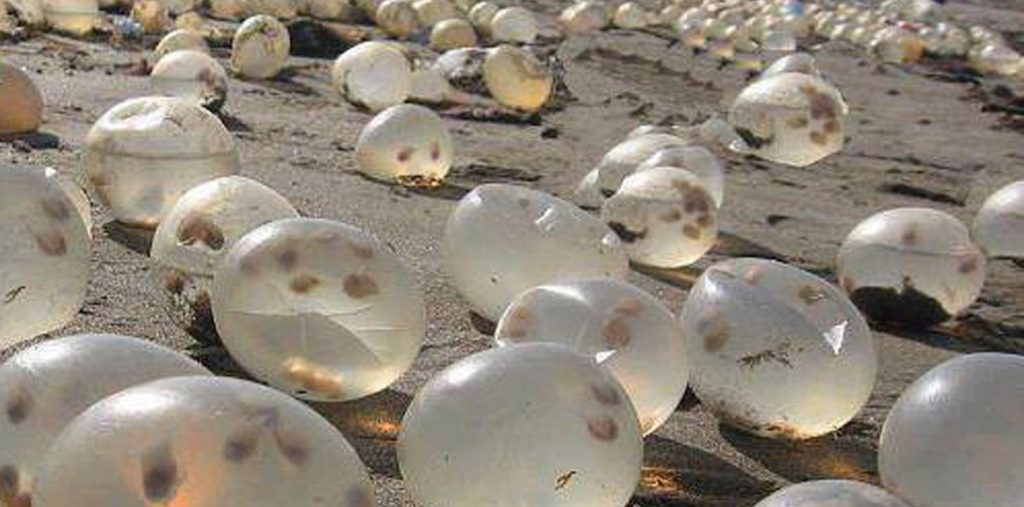 Ninguna especie de tortuga marina desova en Uruguay. Además, ellas cavan una cámara profunda bajo la arena para desovar, la que luego tapan muy bien. Estas esferas translúcidas que se ven en primavera y verano en las costas, principalmente de Maldonado y Rocha, son cápsulas de caracol negro (Pachycymbiola brasiliana) que contienen de 9 a más de 30 huevecillos y están rellenas de sustancias alimenticias para los embriones que allí se desarrollarán.