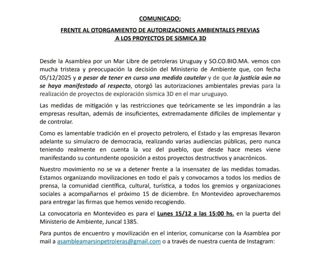Las organizaciones informaron que para conocer los puntos de encuentro en el interior del país, los interesados pueden comunicarse vía correo electrónico a asambleamarsinpetroleras@gmail.com o a través de la cuenta de Instagram de la Asamblea.