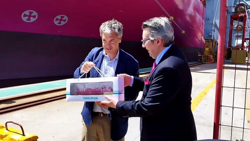 Hubo una recepción en el puerto de Montevideo para recibir a la embarcación de 330 metros de eslora con presencia del ministro de Transporte, José Luis Falero y autoridades del puerto, Terminal Cuenta del Plata (TCP).