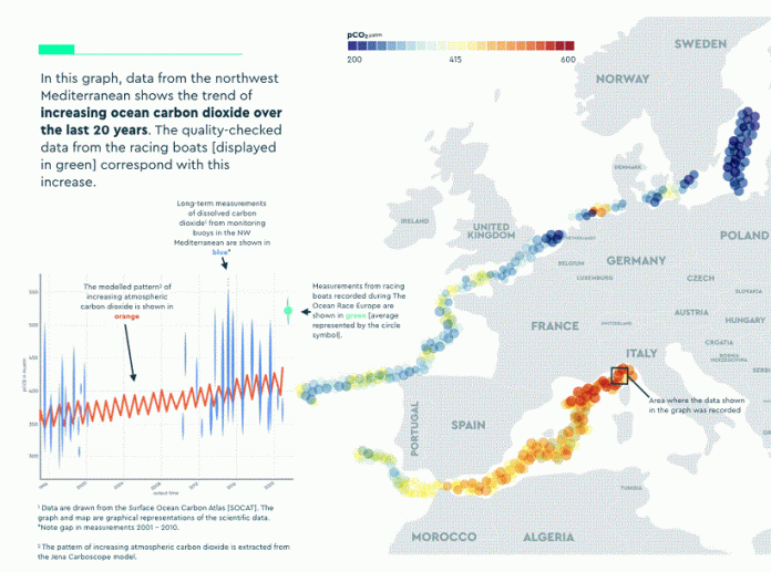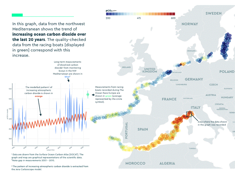 Las mediciones del CO2 disuelto tomadas durante The Ocean Race Europe por 11th Hour Racing Team se han enviado al Surface Ocean Carbon Dioxide Atlas (SOCAT- Atlas de Dióxido de Carbono en la Superficie Oceánica), que proporciona datos para el Global Carbon Budget (Presupuesto Anual de Carbono), una evaluación anual de CO2 que informa los objetivos y predicciones para la reducción de carbono. Es vital que los científicos tengan conocimiento de los niveles de CO2 en el océano para conseguir un presupuesto adecuado y guiar al mundo por el camino correcto con el fin de mantenerse dentro del objetivo del Acuerdo de París de limitar el calentamiento global a menos de 1,5 grados Celsius. Los datos de CO2 también fueron analizados por EuroSea, un programa financiado por la Comisión Europea que mejora los sistemas de observación y predicción de los océanos. Se encontró que los niveles de dióxido de carbono eran más altos en el Mediterráneo, como consecuencia de las cálidas temperaturas y la existencia de muy poco viento.