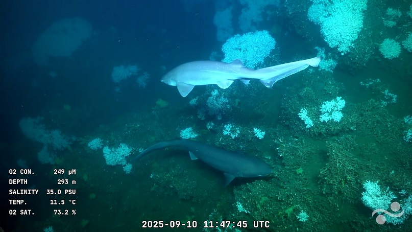 En esta ocasión, las cámaras del robot submarino ROV SuBastian registraron a dos tiburones grises (Hexanchus griseus) nadando juntos en el cañón submarino de Cabo Polonio, a una profundidad de entre 250 y 300 metros.