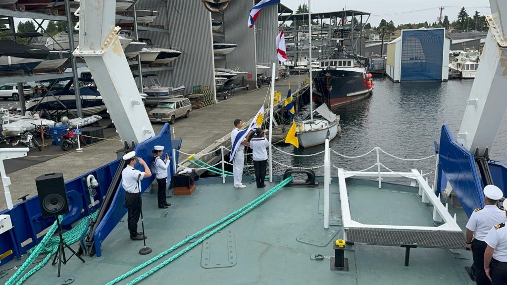 Seattle, EE.UU. – El 17 de septiembre, la Armada Nacional de Uruguay llevó a cabo una significativa ceremonia de abanderamiento del Buque Científico ROU 22 «Oyarvide» (anteriormente conocido como RV Mount Mitchell) en el puerto de Seattle, Estado de Washington. Este evento no solo marca la incorporación de un nuevo buque a la flota nacional, sino que también simboliza el compromiso renovado de Uruguay con el desarrollo de su capacidad marítima y la protección de sus recursos marinos.