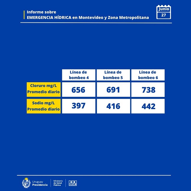 Los límites en promedio diario determinados por el Ministerio de Salud Pública fueron excedidos en la línea de bombeo 6, al igual que sucedió el lunes. Presidencia divulgó el promedio de cloruro y sodio presentes en el agua de OSE este martes. Al igual que el lunes, la línea de bombeo 6 se excedió en los niveles de cloruros y sodio permitidos por el Ministerio de Salud Pública (MSP). Respecto a los cloruros, el informe detalla que hubo un promedio de 656 mg/L en la línea de bombeo 4, de 691 mg/L en la 5 y 738 mg/L en la 6. El nivel máximo de cloruro autorizado por el MSP, tras el pedido del aumento por parte de OSE, es de 720 mg/L, por lo que la línea de bombeo 6 excedió el límite.