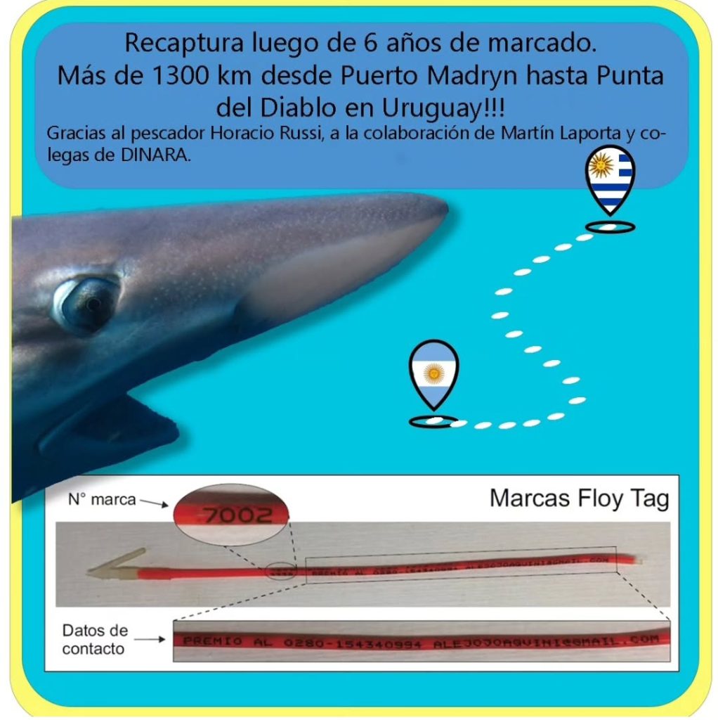 Al analizar la identificación, los técnicos constataron que la marca pertenecía al Programa de Marcado de Tiburones del Proyecto Arrecife (CESIMAR-CONICET) de Argentina. El ejemplar había sido marcado el 3 de febrero de 2025 en la Ría de Puerto Deseado (Santa Cruz) por investigadores de la ONG Por el Mar, CONICET, Proyecto Arrecife y Tag a Giant, y fue recapturado 249 días después, a más de 1.700 kilómetros de su punto de origen.