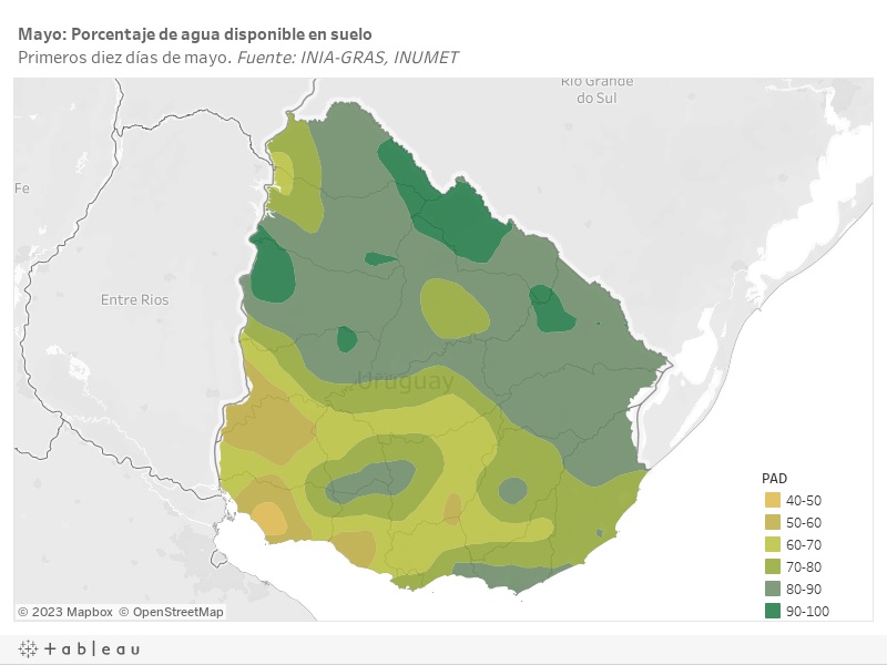 Pese a que el déficit hídrico ha complicado el acceso al agua, sobre todo en el área metropolitana, el porcentaje de agua disponible en suelo a nivel nacional ha ido mejorando desde enero de 2023, según puede deducirse del registro elaborado por INIA-GRAS e Inumet. El registro de los primeros diez días de mayo muestra que el porcentaje de agua disponible en suelo ha llegado en algunas zonas del norte del país al 90% o 100%. Mientras tanto, en la zona del suroeste, en particular en el departamento de Colonia, aún pueden observarse tramos con 40% o 50% de agua disponible.