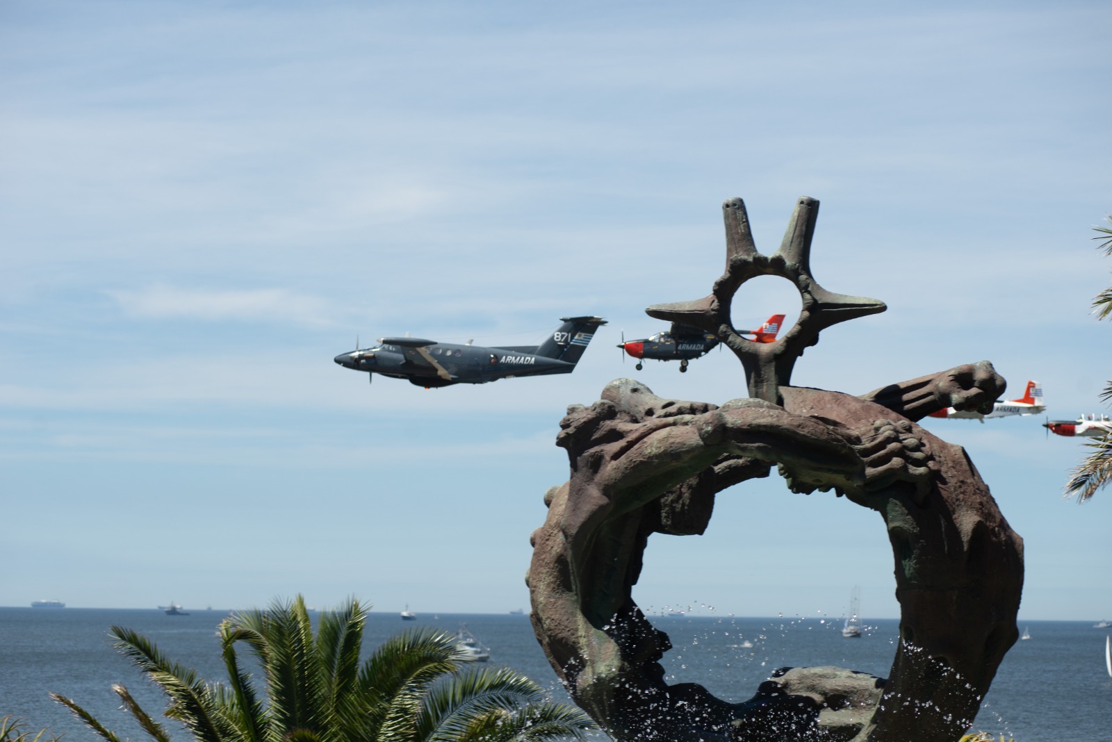 Como cierre, una formación de aeronaves del Comando de Aviación Naval (COMAN) sobrevoló el sector costero, en simultáneo con el acompañamiento desde el mar de unidades de superficie de la Armada Nacional, junto a tres buques de la Marina de Brasil, que participaron en calidad de saludo protocolar.