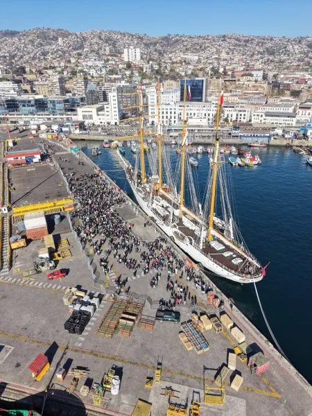 La partida, concretada cerca del mediodía desde el Terminal Portuario Valparaíso, estuvo marcada por el acompañamiento de embarcaciones menores, bocinas y sirenas en la bahía, además de la presencia de cerca de 1.700 personas que despidieron a la histórica “Dama Blanca”, reafirmando el fuerte vínculo entre la institución naval y la ciudadanía.