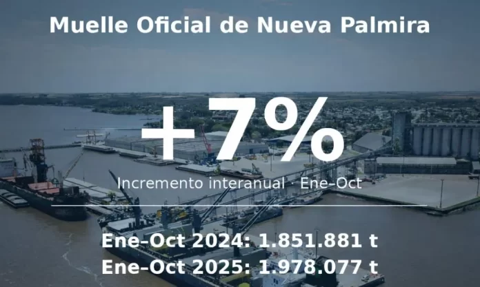 La Administración Nacional de Puertos (ANP) informó que la movilización de mercaderías en el Muelle Oficial del puerto de Nueva Palmira registró un incremento del 7% durante el período comprendido entre enero y octubre de 2025, en comparación con igual lapso del año anterior.